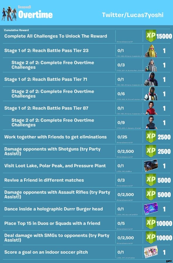 コミュニティ メンバーは、7 月 17 日水曜日に公開された v9.40 アップデートのファイルで Fortnite シーズン 9 のオーバータイム チャレンジを発見した有名なデータマイナー Lucas7yoshi のおかげで、これらの新しいタスクを初めて見ることができました。バトルロワイヤルタイトルのこれらの今後のタスクとその完了要件はすべて以下で確認できます。