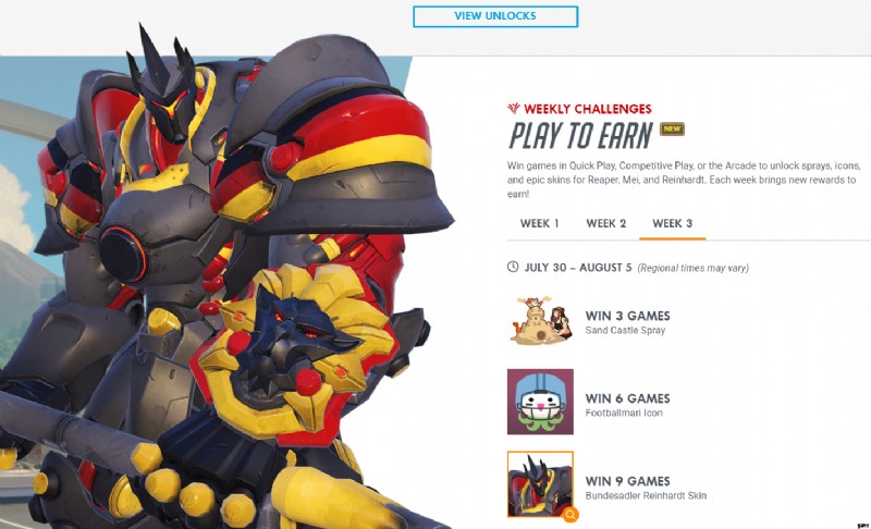 プレーヤーは、新しい Bundesadler Reinhardt スキン装飾アイテムを取得するために必要な 9 つの勝利を集める途中で、Sand Castle スプレー (3 勝利) と Footballmari アイコン (6 勝利) のロックも解除します。