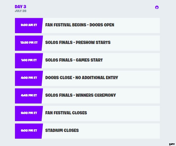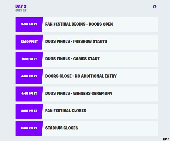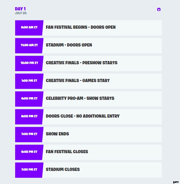カップの初日のスケジュールでは、Creative Finals と Celebrity Pro-Am イベントが行われます。トーナメントの初日のスケジュールに続いて、2 日目と 3 日目のスケジュールでは、祭典のバトルロワイヤル部分でデュオとソロの大会が行われます。イベントの公式スケジュールは以下で確認できます。