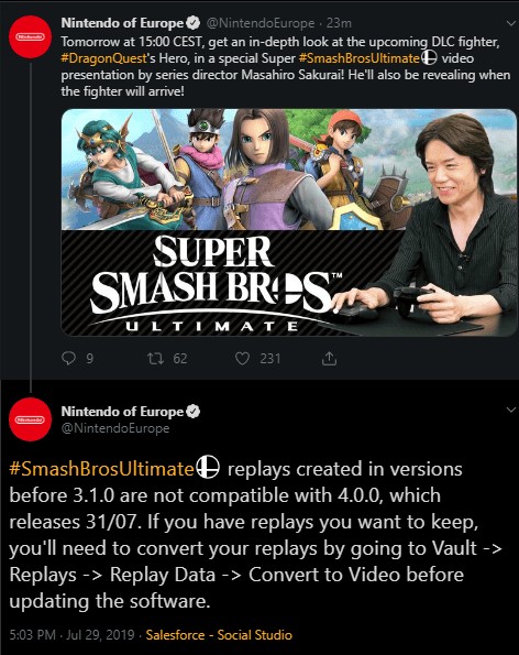 この新しいアップデートの公式発表は、任天堂のさまざまな Twitter アカウントで行われました。この一連の新しい変更の正式なリリース日時は明らかにされていません。ただし、現在削除されている欧州任天堂の Twitter アカウントからのツイートは、大乱闘スマッシュブラザーズ アルティメットのバージョン 4.0 の日付を漏らした可能性があるようです。残念ながら、更新の正式な時間は、現在削除されている欧州任天堂からのツイートには表示されませんでした.
