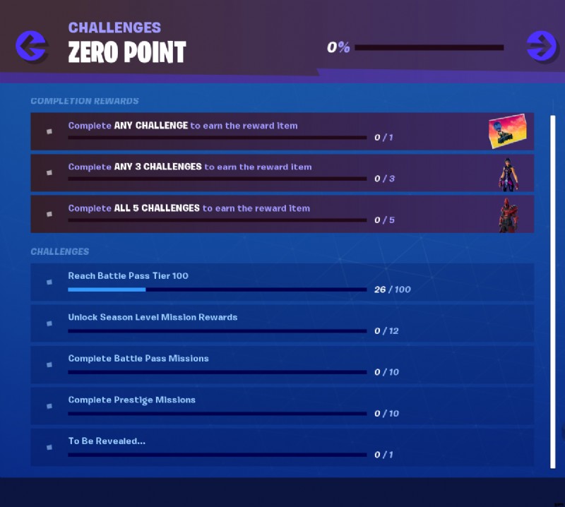 Zero Point チャレンジからすべての報酬を獲得するには、合計 5 つの目標を達成する必要があります。これらの目標は、シーズン X バトル パスの Tier 100 に到達すること、シーズン X レベル ミッション報酬のロックを解除すること、バトル パス ミッションを完了すること、そしてまったく未知のタスクを 1 つ扱うことです。