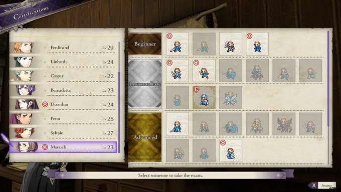 ファイアーエムブレム 3 家の認定リストで、さまざまなキャラクターが利用できる初級クラスを確認してください。前述のとおり、レベル 5 に達すると、どの生徒 (メイン キャラクターを含む) もこれらの試験を受けることができます。また、各認定クラスの要件を一覧表示しているので、適切なスキルをレベルアップしていることを確認できます。
