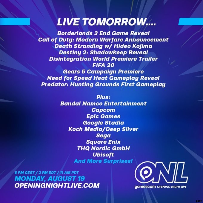 Gamescom 2019 オープニング ナイト ショーのライブ ストリーム中継は、8 月 19 日月曜日の午後 8 時 (CET) / 午前 11 時 (PST) / 午後 1 時 (CST) / 午後 2 時 (EST) に行われます。 Gamescom 2019 オープニング ナイト ショーの公式放送報道をすべて見ることができる複数のチャンネルがあります。これらの表示オプションはすべて以下にあります。