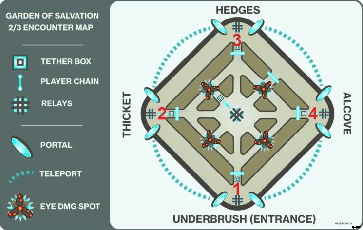 たとえば、力学に関しては、このように少し見えます。 Reddit ユーザーの RealyRayly によるこの便利なグラフィックは、全員が同時にエンライテンド バフを確実に有効にするために、ファイアチームが最終的に集めたい 4 つの別々のエリアを示しています。基本的に、エリア 1 のマークされた入り口で全員が一緒にバフアップし、プレーヤー 1 と 2 を残して防御し、他の全員が時計回りにローテーションします。 2 番目のエリアがクリアされたら、プレイヤー 3 を置き去りにし、残りのプレイヤーが再び回転してから、全員が最も近いボックスにアクセスしてこの新しいエリアをクリアしてバフを更新します。