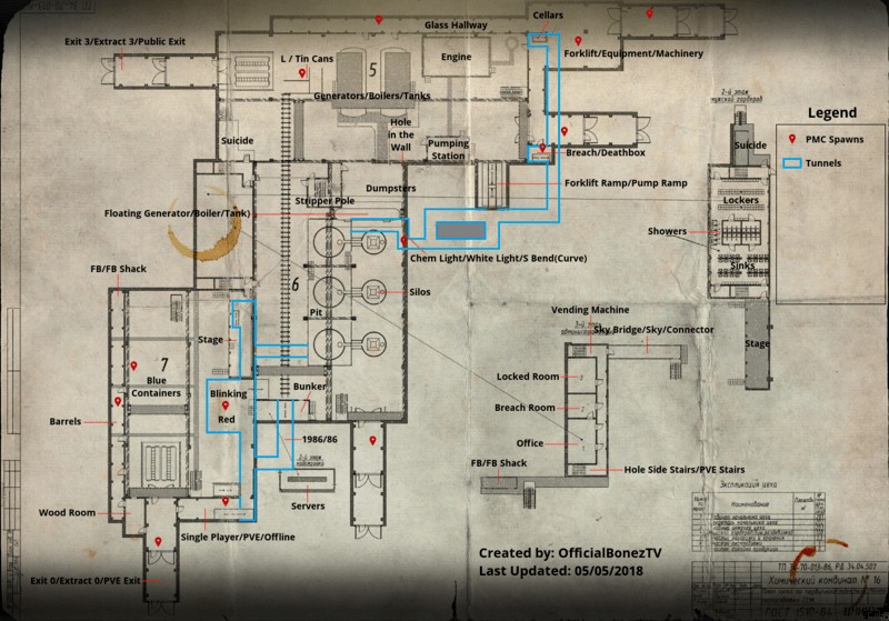 Gamepedia 提供の下の画像で、プレイヤーがタルコフ工場からの脱出マップで使用できるすべての抽出ポイントを見つけることができます。