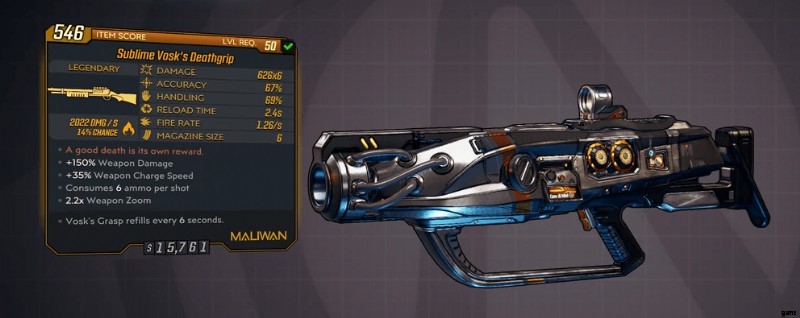 プレイヤーは、Vosk の Deathgrip が、マリワンのそれほど素敵ではない人々によって製造された伝説的なショットガンであることがわかります。この特定の伝説的なショットガンは、いくつかの異なる方法で入手できます。メイヘム モード 4 がアクティブな場合、パンドラのグレート ヴォールトのトロイ カリプソや無敵のウォタン、真夜中のケルン アクティビティのヴァルキリー隊からドロップする可能性があります。