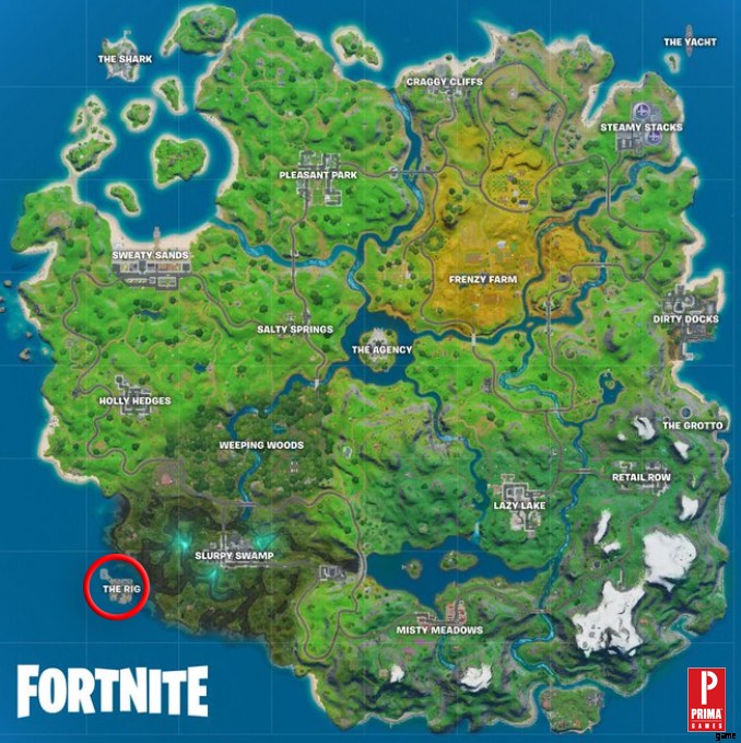 この危険なミッションに乗り出すプレイヤーは、まずセキュリティ プランを盗むためにリグの場所に向かう必要があります。このエリアは、バトル ロワイヤル タイトルのマップの南西隅にあります。この地域がどこにあるかは、下の地図で視覚的に確認できます: