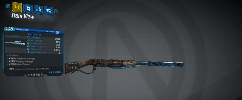 あなたが遭遇する敵の種類ごとに異なる武器を持ちたい人なら、まあ、それはただの特殊な殺人だと思います.ロボットは銀河系の絶対的なクズだと思うなら、それなら The Hunted で間違いはありません。このユニークなスナイパーライフルは、「ソーデッド」と呼ばれる特別な武器効果があり、ロボットに対するダメージが大幅に増加し、銃の基本ダメージに加えて 175% 増加したダメージを与えます。はい、それは大きな割合ですが、武器がスコープでスポーンしないことも保証します.スナイパーライフルであるにもかかわらず、スコープがないということは、ショットガンの射程で実際に狙いたいということを意味するので、その制限を念頭に置いてください.それとは別に、ロボットを粉々に爆破することもできます。