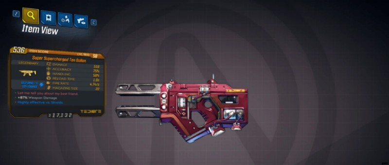 テンガロンの特殊武器効果は「私の親友について教えてください」と呼ばれます 、そして銃の発砲率は低下していますが、ダメージが増加しているため、クールです。リロードすると、捨てられた銃はドローンになり、あなたが向いている方向の敵を撃ち、その後のすべてのリロードがそのドローンの弾薬として機能します。リロード スローで敵にダメージを与える能力を失います。主に、弾丸を刈り取り続ける限り本質的にくっついているこの後続のドローンを拾うという事実のために、トレードオフは許容できると正直に考えています。武器を回転させない限り、トーンとテン ガロンの両方の増加したダメージを楽しむことができます。