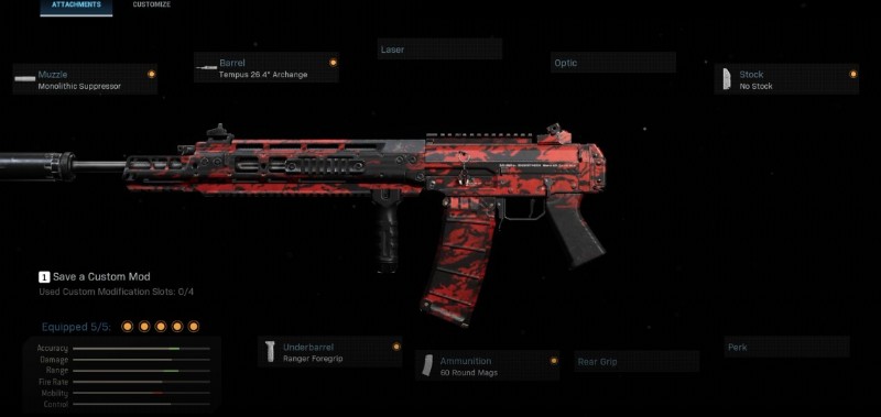 モノリシック サプレッサーとテンパス 26.9 インチ アークエンジェル バレルは、このアサルト ライフルのダメージ範囲を大幅に拡大し、長距離戦でのダメージ低下を心配することなく、より長い距離でパンチを詰め込むのに役立ちます。ストックがないことで、アサルトライフルの照準速度が向上します。最初にターゲットに正確なショットを当てることは、銃撃戦に勝つための重要な要素です。 Ranger Foregrip は適切な反動制御と照準の安定性を提供し、特にスプレーしているときにショットをターゲットに着地させるのに役立ちます。最後に、60 ラウンドのマガジンにより、途中でリロードしなければならなかったために銃撃戦に負けることはありません。