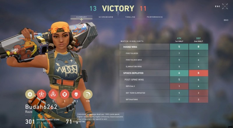 高いプレイヤーは、試合で消費する 1,000 クレジットごとに大量のダメージを与えることができたことを意味します。このパフォーマンス測定値が低いということは、プレイヤーが消費した 1,000 クレジットごとに大量のダメージを与えることができなかったことを意味します。これは、プレーヤーがラウンドごとに費やしたお金をどれだけ積極的に使っているかを示すため、プレーヤーにとって重要な測定値になる可能性があります。大量のクレジットを消費せずに敵に大量のダメージを与えることができるプレイヤーは、高価なアイテムや武器をすべて有効にする必要がないことを意味します。対照的に、Valorant Econ Rating が非常に低い場合は、プレイヤーが多くのクレジットを消費したが、購入したものを使用してダメージを与えたり、チームを支援したりできなかったことを意味します。