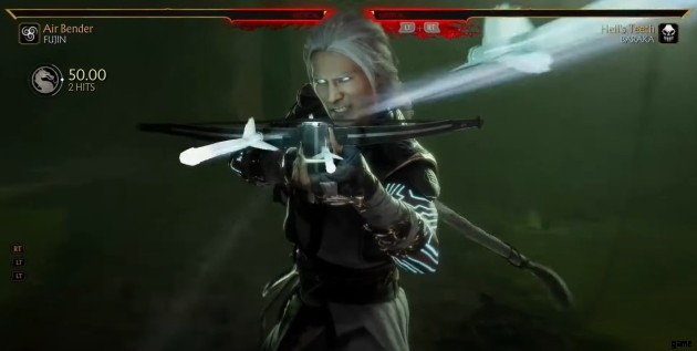 フージンの致命的な打撃は、エロン・ブラックのように、フルスクリーンの発射物から始まり、クロスボウのボルトで敵をなぞってから、剣に突き刺します。カストはまた、Fujin の 2 番目の Fatality の公式デビューも見ました。それはかなりひどいです!