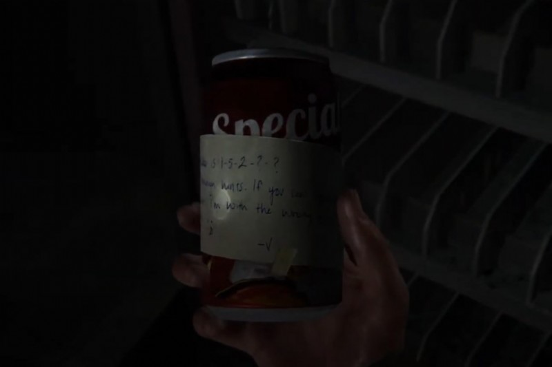 プレイヤーは、ゲームのメイン ストーリーのトンネル セクションで、貴重な物資がたくさんあるラウンジに通じるドアを見つけます。この特定のラウンジドアのコードがソーダ缶に記載されているという誰かが書いたメモを見つけることができます.幸いなことに、あなたがいる場所のすぐ隣に自動販売機があり、その上にソーダ缶があります.残念ながら、最初の 3 桁 (1、5、2) だけで完全なコードを書き留めることはできません。ただし、ドアのキーパッドは 1 から 5 までしか通らないため、3 と 4 は 2 つの選択肢しかありません。最後の 2 桁。