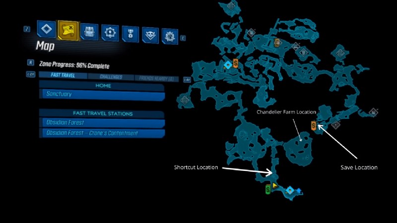 Borderlands 3:Bounty of Blood では、Gehenna の Obsidian Forest 地域にある Bellik Primis のボスを倒すと、シャンデリアの場所を見つけることができます。このエリアに精通している場合は、ボスがエリアの一番端にあることを覚えているかもしれません。そのため、シャンデリアの農場に向かう必要があります。武器のジャンプ ブーストに慣れている場合は、そのトリックを使用して棚の上に乗り、エリア ヘッドを切り抜けて直接ボス戦に入ることができます。私たちが話していることを知っている場合は、下の地図でショートカットの場所を詳しく説明します。そうでない場合は、Bellik Primis のボス戦に到達するまで、黒曜石の森エリアを走る方が簡単でしょう.