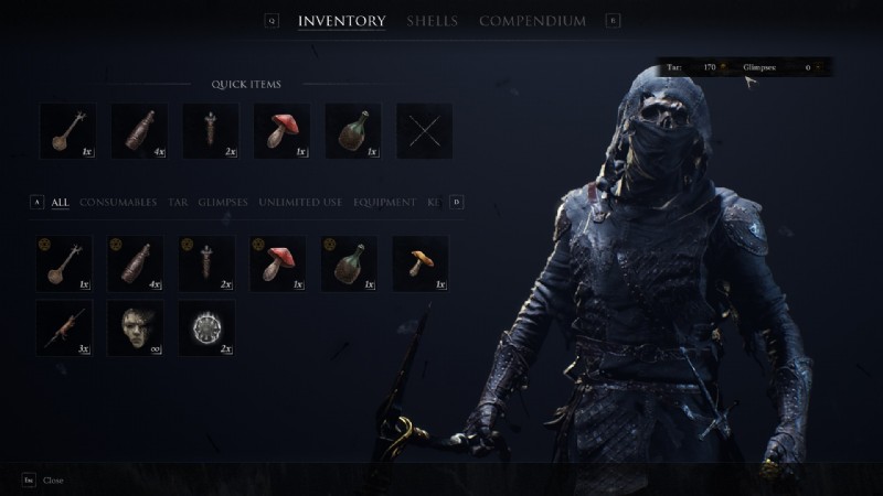 インベントリを開いて、現在使用しているシェルの横にある Tar と Glimpses を表示することもできます。能力に加えて、Turnished Mask などの特別なアイテムを使用すると Glimpses も消費されます。