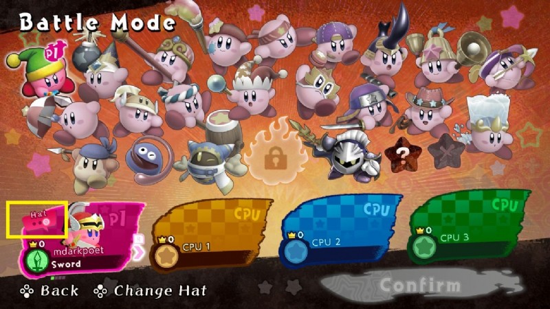 カービィファイターズ2では、キャラクター選択メニューで帽子を変更できます。キャラクターにカーソルを合わせると、プレイヤー アイコンの左上隅に追加の帽子オプションがあるかどうかを確認できます。