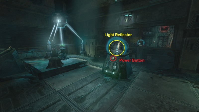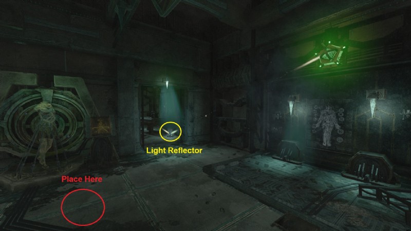 実験室に入るには、小さなパズルを解く必要があります。このパズルでは、壁から光を反射する床から小さな先のとがった物体を拾う必要があります。これを持って、像の前にドロップする必要があります。