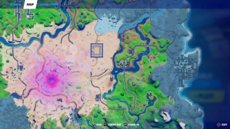 しかし、この新しい Fortnite マップの Razor Crest は正確にはどこにあるのでしょうか?ええと、実際にはマップの真ん中にある大きな砂のエリアにあります!下のスクリーンショットで、それがどこにあるかを正確に確認できます。