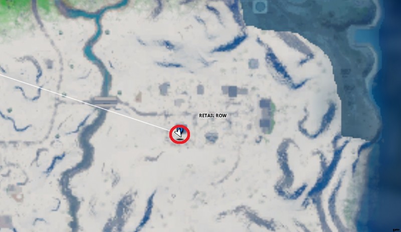 埋められたブルー XP コインは、フォートナイトの小売店の列にあります。上のマップ画像では、Blue XP Coin が見つかる正確な場所を丸で囲んでいます。具体的には、Retail Row の家の 1 つの近くにある不審な土の塚を探しています。