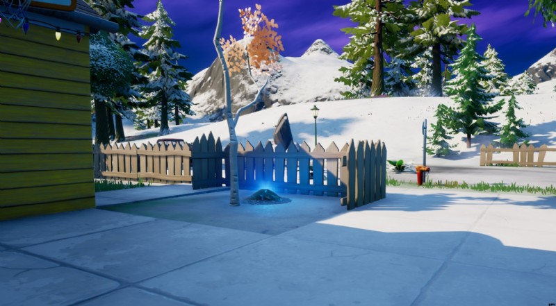 Fortnite で埋められたブルー XP コインを示す土の山は、雪山の近くの地域の南端にあるリテール ロウの黄色い家の近くにあります。