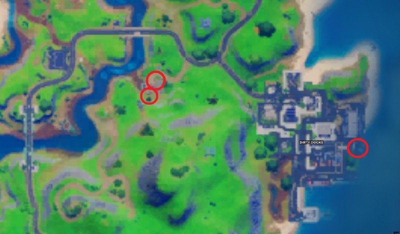 上の地図画像では、Fortnite のコンパクト カーとダーティ ドックの両方で各車のパーツを見つけることができる場所を丸で囲みました。コンパクトカーズにいるときは、チェーンフェンス近くのエリアの前端に向かって最初の車の部分があります.