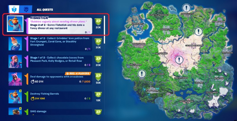 これらのいずれかに到達すると、タスクの実際の「夕食の提供」部分について混乱する可能性があります。すべてを簡素化するために、フォートナイトでフィッシュスティックと彼のデートに豪華なディナーを提供する方法を説明するガイドをまとめました!