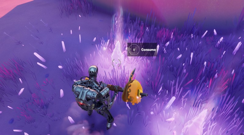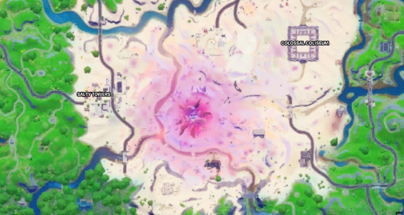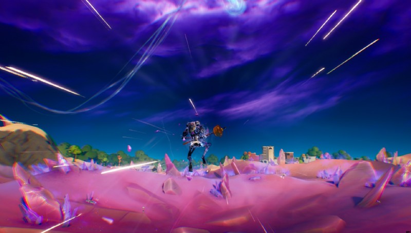 Fortnite マップの中央 (上の画像を参照) に、砂とピンク色の結晶で覆われた広大な土地が見えます。このエリアに向かい、収穫ツールを使ってこれらのピンク色の結晶を分解してください。