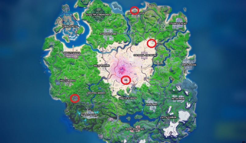 上の地図画像では、Fortnite のレストラン キッチンを訪れることができる 4 つのレストランの場所すべてを丸で囲みました。