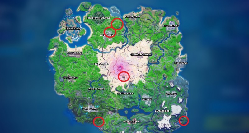 Fortnite には複数の NPC がいて、すべてではありませんが少数の NPC を雇うことができます。彼らを雇うことで、彼らはあなたについてきて、敵プレイヤーからあなたを守ってくれます。上の地図画像では、NPC を雇うことができる場所のいくつかを丸で囲んでいます。
