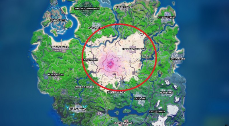 これらのチャレンジを完了するには、Fortnite マップの中央にある砂地に着陸する必要があります。上の画像では、トンネルを掘ることができる砂が見つかるエリアを丸で囲んでいます。そこに着いたら、砂トンネルを掘るために特定のことを行う必要があります。