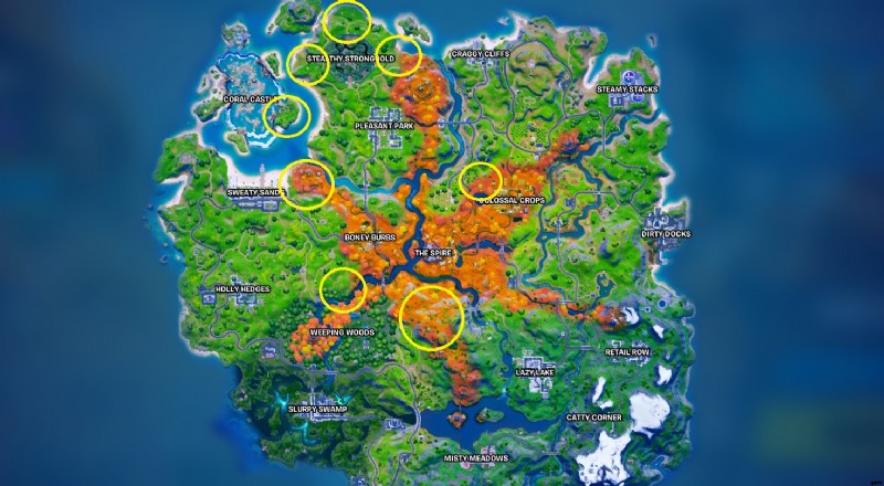 上の地図画像では、弾む卵を探すことができたいくつかの場所を丸で囲んでいます。草が茂った場所の木の下にいるので注意してください。