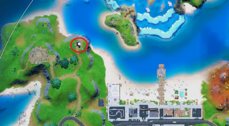 上のマップ画像では、Fortnite で Rebirth Raven を見つけることができる場所を丸で囲んでいます。ご覧のとおり、Rebirth Raven は Sweaty Sands の西にある小さな家にあります。家は海を見下ろす丘の上にあり、とても居心地が良いです。