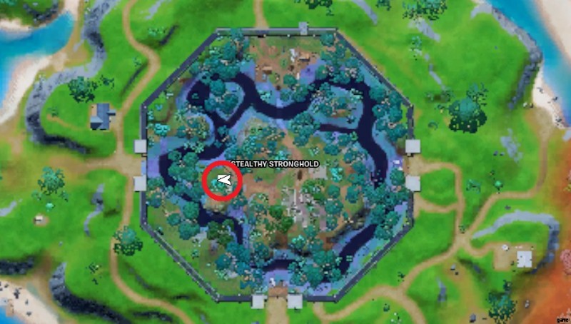 上の地図画像では、フォートナイトでのララ クロフトの位置を丸で囲んでいます。ララ クロフトは、マップの北端にあるステルス要塞内にあります。