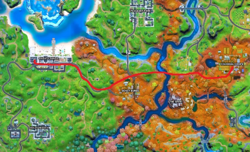 上の地図画像では、Sweaty Sands から Colossal Crops までの経路を概説しています。