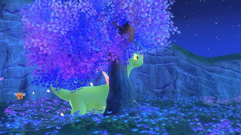 - メガニウムがずっと木の後ろにいて周りを見回しているときに (メガニウムが木の後ろにいる必要があります)、木の右上の枝にフラッフルーツを投げてフルートを振ってください。