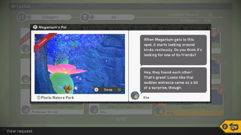 - この 4 つ星の写真を選択してミラー教授に見せ、新しいポケモン スナップでメガニウムのパルのリクエストを完了してください。
