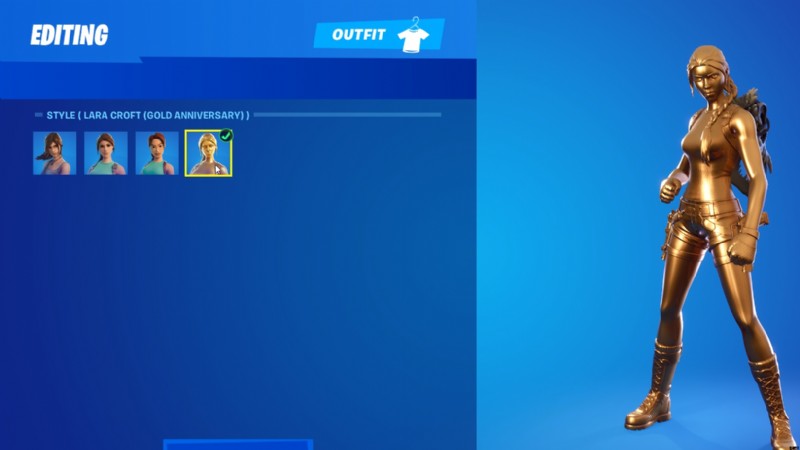 ララ クロフトのゴールド アニバーサリー スキンのロックを解除したら、ロッカーに移動してララ クロフトの衣装を選択し、[スタイルの編集] を選択してゴールド アニバーサリー オプションを選択すると、それを着用できます。