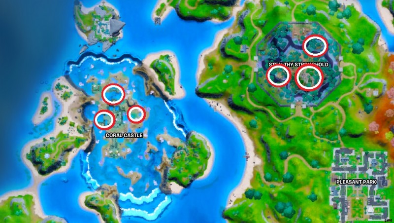 上のマップ画像では、ステルス要塞とコーラル キャッスルの両方で襲撃するアーティファクトを見つけることができる場所を丸で囲みました。