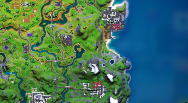 上の地図画像では、Dirty Docks と Retail Row の両方でキャット フードを見つけた 4 つの場所 (名前付きの場所ごとに 2 つ) をマークしました。