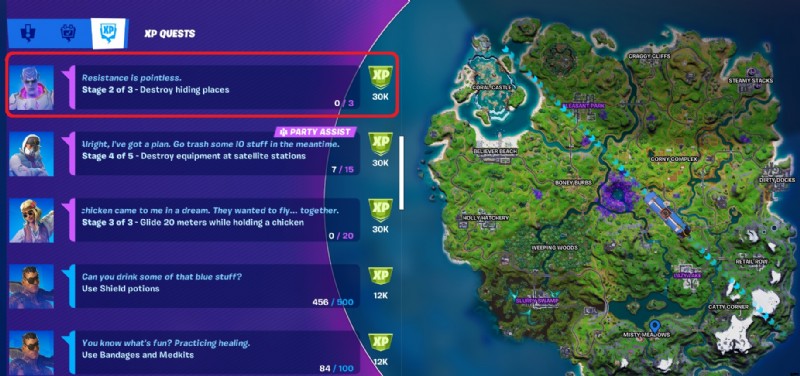 さらに 2 つの隠れ場所を破壊して続行すると、クエストは完了としてマークされます。 「Destroy Hiding Places」クエストの完了報酬として、Fortnite で 30,000 XP を獲得できます。