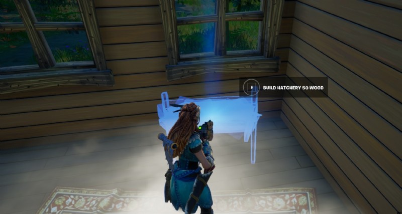 PC で「E」を長押しすると、木製の孵化場が目の前に現れました。 Fortnite の第 7 週のチャレンジの一環として、このレジェンダリー クエストを完了して木製の孵化場を建設すると、45,000 XP を獲得できます。