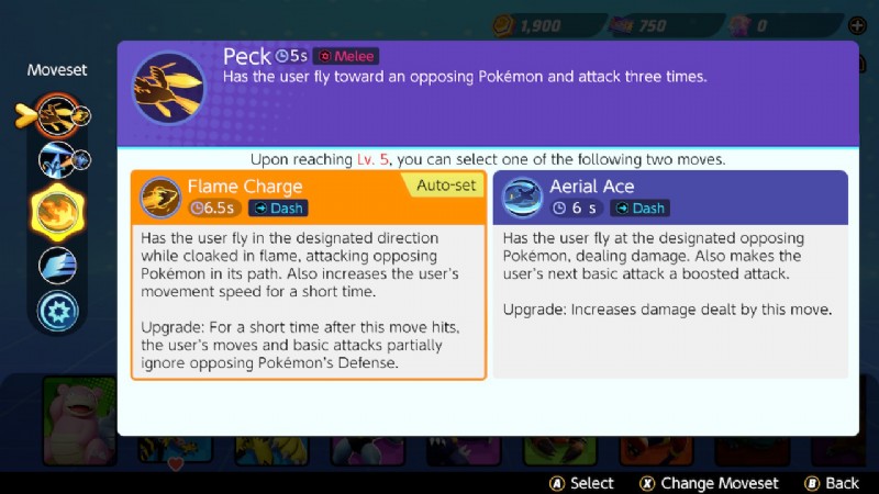 レベル 5 に到達すると、試合中に方向パッドの左または右を押して選択したものに応じて、ペックはフレイム チャージまたはエアリアル エースのいずれかにアップグレードされます。