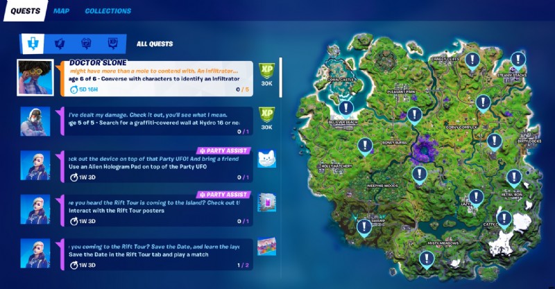 クエスト メニューでクエストを選択すると、Fortnite マップ全体の NPC の場所がポップアップ表示されます (上の画像を参照)。