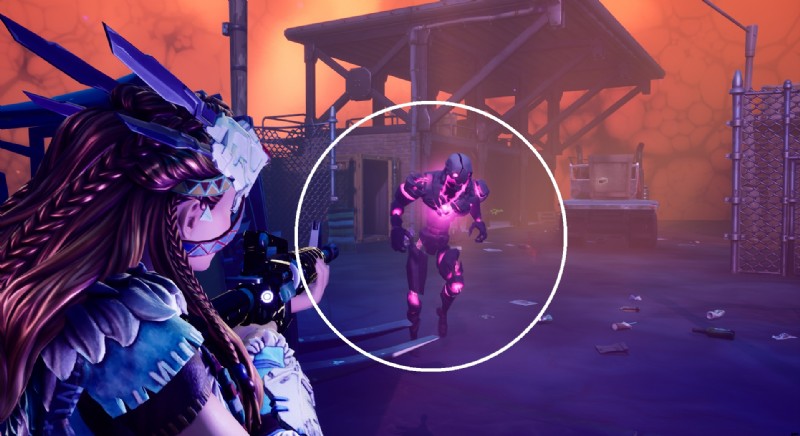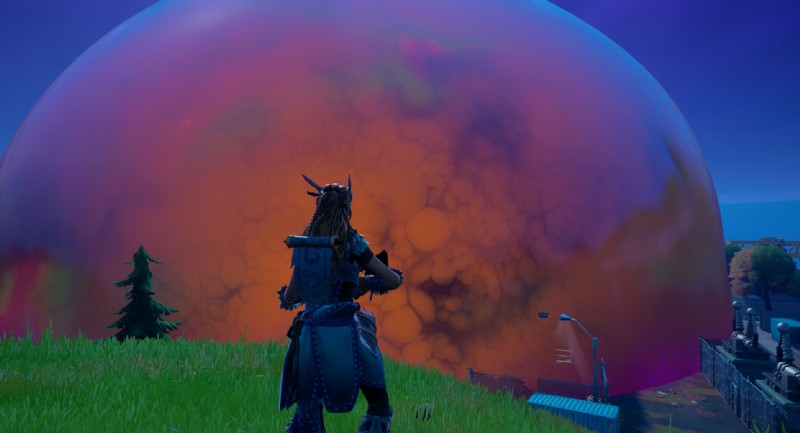そこに到達すると、その場所を覆う大きなオレンジと紫の球体が表示されます。 Sideways に歩いて入るか、Battle Bus から問題なく立ち寄ることができるはずです。内部には、キューブ モンスターと呼ばれる AI の敵がいます。