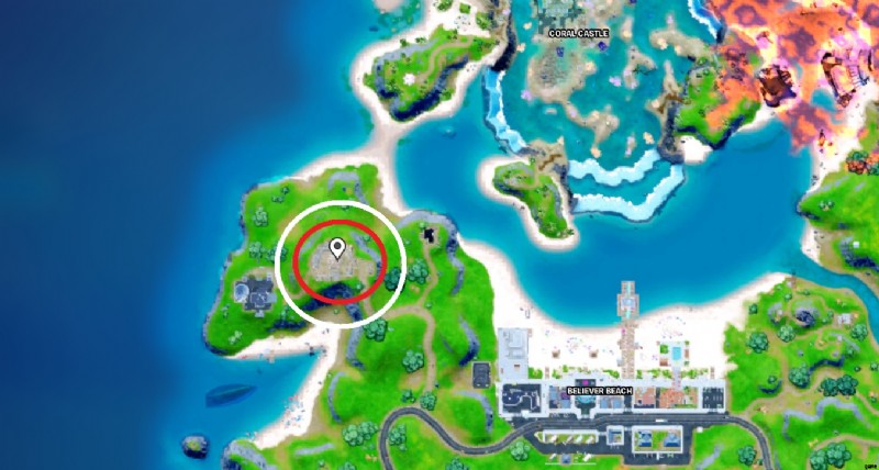 フォートナイトでクランペット砦を見つける際に最初に知っておくべきことは、マップ上の場所です。上の地図画像では、フォート クランペットの場所を示しています。ご覧のとおり、ビリーバー ビーチのすぐ西にあります。