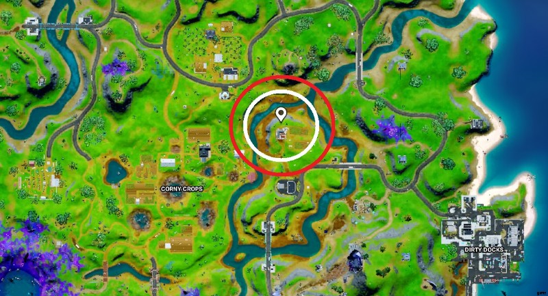 Steel Farm でチェストを開くクエストに関して Fortnite プレイヤーが最初に抱く質問は、Steel Farm の場所です。上の地図画像では、Steel Farm の場所を丸で囲んでいます。 Corny Crops と Dirty Docks の間にあります。