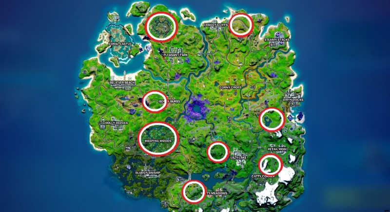 上の地図画像では、フォートナイトでオオカミが見つかったすべてのエリアをマークしました。 Fortnite でオオカミがどのように見えるかわからない場合は、下の画像も含めて簡単に見つけられるようにします。