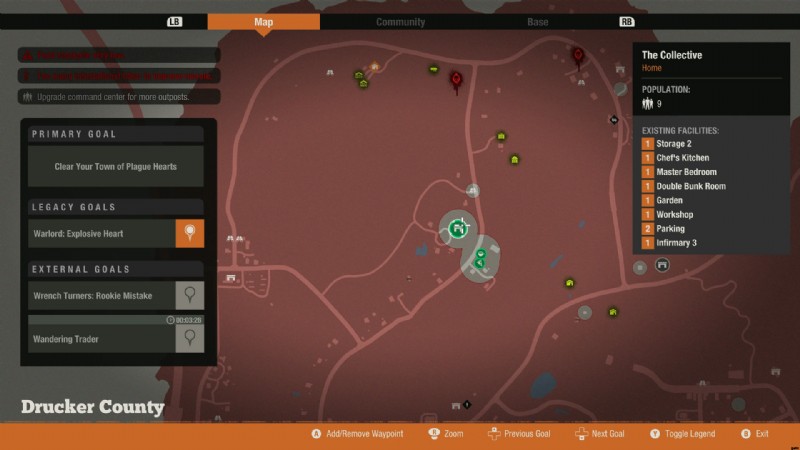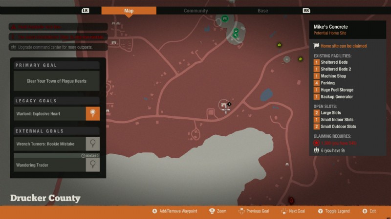 State of Decay 2 のドラッカー郡には 7 つの基地があり、そのうちの 1 つがメイン ストーリーの一部としてアンロックされる本拠地です。これらの基地のほとんどはマップの端近くに位置しています。つまり、これらの場所にリソースを降ろし、ある基地から次の基地に移動するには、さらに遠くまで移動しなければならない場合があります。