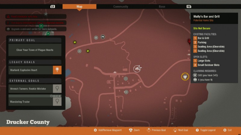 ドラッカー郡の東側に向かう途中、Wally's Bar and Grill で基地候補地に出会うことができます。この基地はマップの中心に近いため、他の基地の場所よりもアクセスしやすくなっています。 Wally’s Bar and Grill は 500 の影響力と 4 人の生存者しか必要としないため、Drucker County マップ上で安価な拠点の 1 つになります。