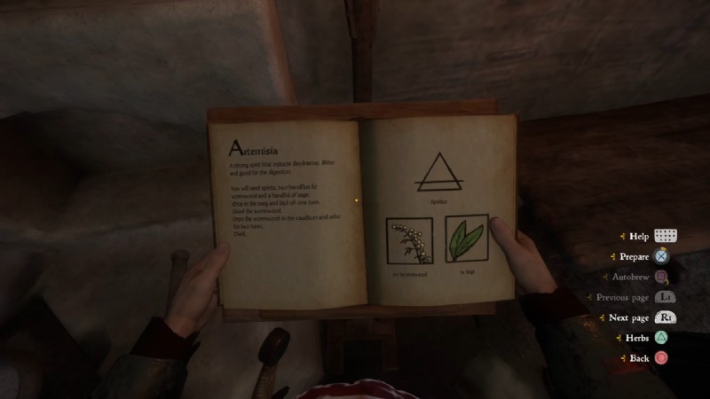 地面の角を大釜に落とし、1ターン沸騰させます。マリーゴールドとカモミールを大釜に入れ、さらに1ターン沸騰させます。よもぎをすりつぶして大釜に加えますが、沸騰させないでください。